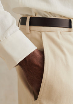 Details I Real horn button, flat front, front zipper, slanted side pockets, one piped back pocket.